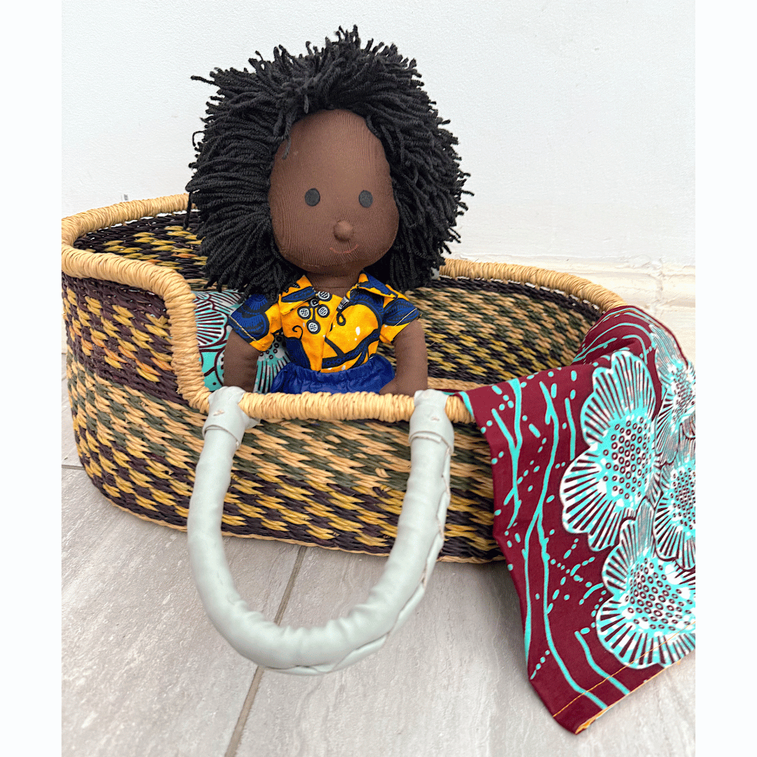 Bring imaginative play to life with our beautiful handwoven doll baskets, crafted with care by our skilled artisans in Ghana. Each basket is a miniature version of our signature baby Moses baskets — made from sustainable elephant grass and finished with cotton bedding for gentle play.